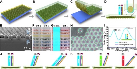 逆反射结构色薄膜的(A-D)制备步骤, (E-I)结构和光学特性,以及(J)照明/观察同轴时随角不变色和(K)照明/观察不同轴时随角变色的示意图