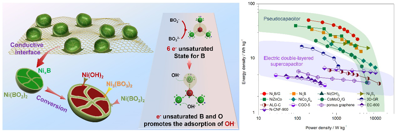 为获得高性能超级电容器电极材料,西安交通大学金属材料强度国家重点实验室柳永宁教授和陈元振副教授课题组联合澳大利亚伍伦贡大学郭再萍教授和周腾飞研究员课题组,在前期偏硼酸盐增强(Ni,Co)(OH)2结构稳定性以提高循环寿命研究工作的基础上,制备出了具有核壳结构的硼化镍/偏硼酸镍复合材料,将其用于非对称超级电容器正极,表现出优良的电容性能。究其原因,一方面是较小的颗粒尺寸有效地提高了材料利用率并降低离子的扩散路径;另一方面,复合材料厚的偏硼酸镍(Ni(BO2)2)壳层,因其BO2-中B原子处于电子不饱和状态,与硼酸显酸性的机理(B(OH)3+ H2O = B(OH)4-+H+)类似,Ni(BO2)2也容易吸附OH-,这促进了电化学反应动力学,因此,使活性材料拥有了优良的倍率性能和循环性能。向复合材料中加入石墨烯后,进一步提高了导电性,使其表现出更高的比容量和优异的循环性能.