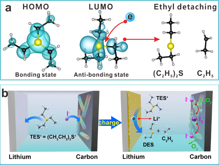 (a)三乙基碘代硫(TESI)有机阳离子的HOMO、LUMO轨道;(b)三乙基碘代硫在锂负极表面原位生成SEI膜示意图。