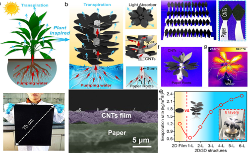 基于前期发展的一种水-空界面毛细力诱导挤压,中国科学院宁波材料技术与工程研究所陈涛研究员团队构建了大面积、可任意转移的碳纳米管薄膜的方法(Chem. Mater. 2016, 28, 7125;ACS Nano 2019, 13, 4, 4368-4378),最近,该团队通过毛细力转移的方法,在水空界面上将碳纳米管薄膜和商业用打印纸原位复合,构建了一种柔性、可剪裁且可图案化的非对称碳纳米管复合纸。受到大自然中树木的结构的启发,树木能够在三维方向上生长,并具有分层的叶子和根用来增强蒸腾作用,研究人员进一步将这种图案化的非对称碳纸经过特定的剪裁、组合成3D树形结构,并将其运用于光热水纯化(如图1)。结果发现,这种3D树形结构的光热蒸发器相比较2D平面结构具有一个更强的光热水蒸发能力,其海水纯化能力最高能到达2.38kg/m2/h(Solar RRL 2019, DOI: 10.1002/solr.201900004)。