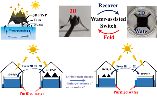 然而,当处于一个不受限的系统中时,2D结构有时比3D结构具有更大的优势。因此,怎样简单、快速地实现光热蒸发器2D/3D结构的转换来适应不同的环境仍然面临挑战。该团队通过吡咯单体在纤维素纸表面原位氧化聚合得到聚吡咯杂化纸(PPyP),并利用对PPyP微观/宏观层面的协同调控,实现了最佳的光热水纯化速度。相比于传统固定的3D结构,该PPyP可实现2D/3D结构的相互切换(如图2),并具有很好的切换稳定性,从而可以更好地适应不同的应用环境(ACS Appl. Mater. Inter. 2019,11,15498-15506)。