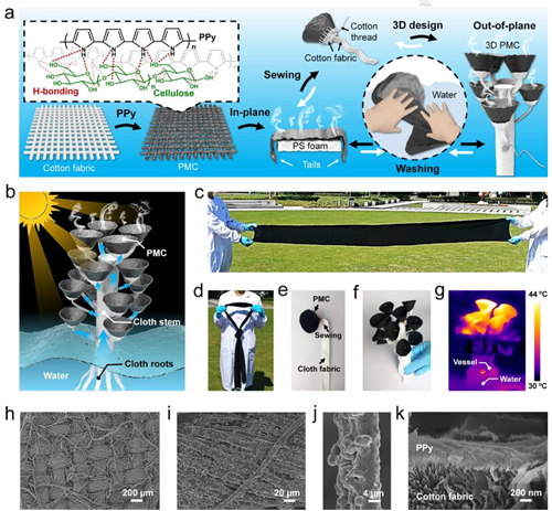 图3 低价、大面积、高机械稳定性、可洗涤和可缝制的聚吡咯棉布用于海水淡化