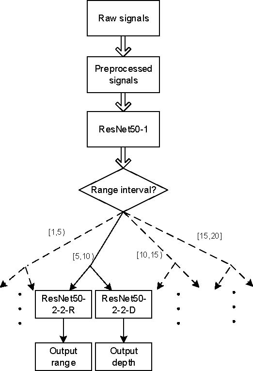 这种基于深度学习的水声被动定位方法,通过假设大量环境参数的组合,利用声传播模型生成仿真的大声场数据集,以应对环境的不确定性。为在大数据集上训练深度学习模型,研究人员采用了两步训练策略。第一步,通过一个残差卷积网络确定声源的距离区间(每个区间的尺度为5 km);第二步,对声源的距离和深度进行较高分辨率估计。