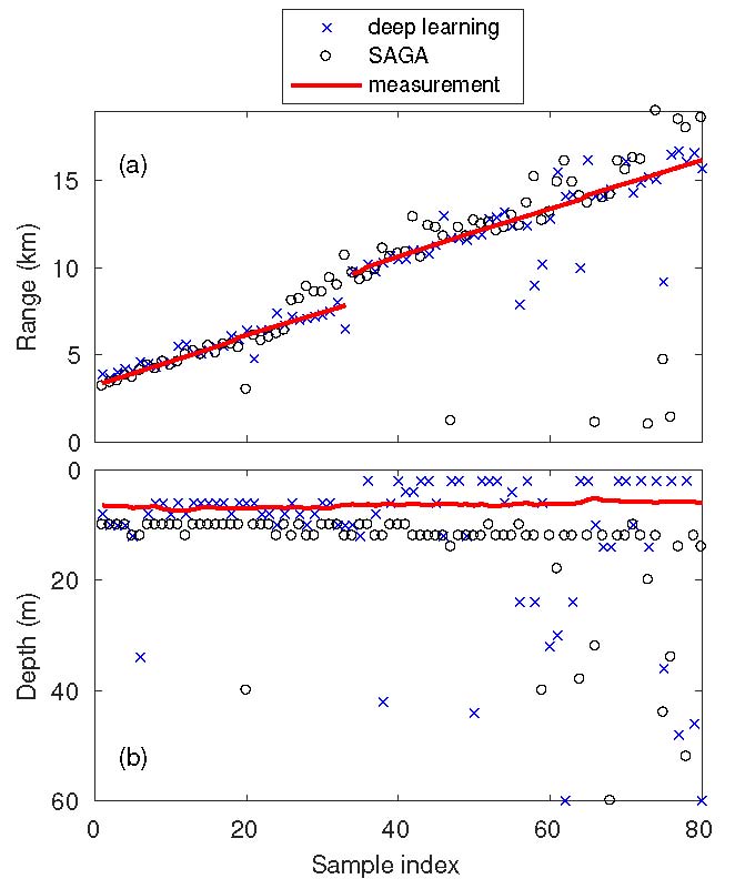图 2 深度学习方法和聚焦匹配场方法的对比:(a) 距离估计结果;(b) 深度估计结果 (图/中科院声学所)