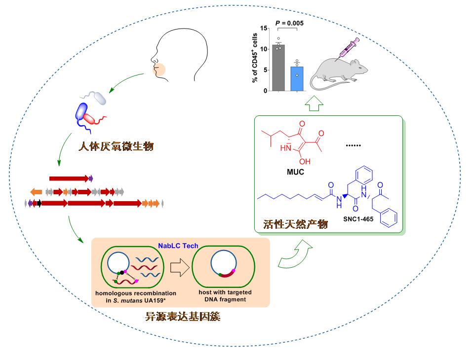 于是,他们以S. mutans UA159为宿主菌,利用其能够摄入外源DNA片段的天然转化能力,开发了基于变形链球菌天然感受态的大片段克隆技术(natural competence based large DNA fragment cloning (NabLC))。利用NabLC技术,通过同源重组能够将长达40 kb基因簇直接克隆到S. mutans UA159基因组指定位置。这一过程不需要经过载体,从而可以避免载体引起的不稳定或不兼容问题。利用此技术成功克隆了来自于不同厌氧菌如变形链球菌、表皮葡萄球菌、梭菌的基因簇,证明了NabLC技术的普遍适用性。对于更长的BGCs,可以经过连续克隆来导入宿主基因组的指定位置。克隆结束后,通过在基因簇中插入诱导型或组成型启动子激活基因簇,成功分离得到来自于口腔链球菌中的两个BGCs所产的新化合物, mutancyclin和癸烯酰二肽SNC1-465,证明了该异源表达系统的实用性。Mutanocyclin基因簇只存在于灵长类口腔来源的链球菌中。生物活性测试表明,mutanocyclin具有抑制免疫细胞浸润的作用,推测其可以帮助产生菌适应口腔环境。这一工作首次构建了针对于厌氧微生物中BGCs表达的宿主系统,为厌氧微生物——特别是人体来源的厌氧细菌——中次级代谢产物的挖掘奠定了基础。