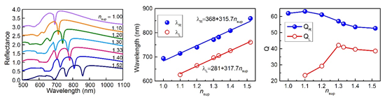 在此,研究团队提出了一种基于金属-介质-金属纳米结构阵列的新型SLR,研究结果显示,在越不对称的介电环境中其品质因子反而越高。在可见光波段和空气/玻璃介电环境下,所提出的SLR在直入射下的品质因子为62,在斜入射下为147,数倍于传统SLR在相同波段和条件下的最高品质因子。计算结果显示,基于该SLR水溶液光微流传感器的性能评价指标(FOM,Figure Of Merit)可达25(数倍于传统的LSPR,SPR或SLR传感器),其灵敏度为316nm/RIU。该研究结果不仅有望为高灵敏度的生化分析提供新型的光学检测方法,而且为SLR的进一步发展提供了新的研究思路。