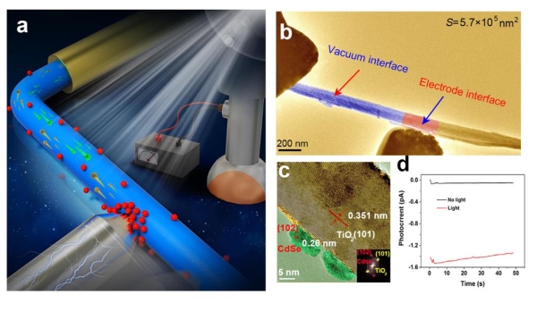 针对以上问题,孙立涛教授团队自主发展了一种新型的原位光电-电子显微学技术,基于此构建了目前世界上最小尺度的量子点异质结太阳能电池结构(仅包含单根纳米线、量子点和电极,如图1a 和 1b所示),在光场作用下可同时实现材料结构的原子尺度表征(如图1c所示)和器件中皮安精度光电流的原位测量(如图1d所示)。通过原位调控光电子可能发生复合的界面大小,大大改善了电池的转化效率,揭示了界面工程对太阳能电池转化效率提升的重要作用。该研究成果有助于更好地理解量子点异质结太阳能电池高转换效率的内在机制,促进高转化效率太阳能电池及相关光电器件的研究与优化设计。同时,该成果也为直接研究纳米尺度的器件提供了最佳实验条件,推动原位器件电子显微学的快速发展。