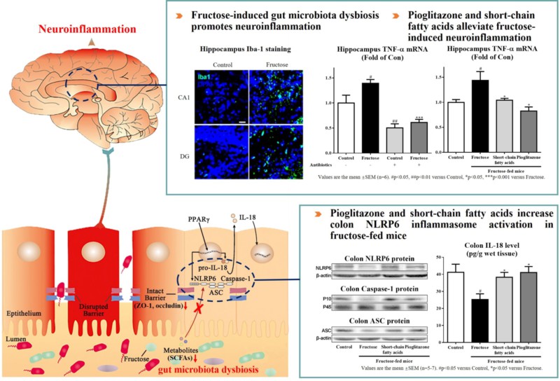 过量果糖摄入可引发多种疾病如胰岛素抵抗、肥胖症、糖尿病、高血压、非酒精性脂肪肝、肾炎、代谢综合征、中枢神经炎症等。该团队前期研究发现高果糖可激活中枢神经胶质细胞而产生神经炎症,使部分功能脑区神经元丢失,损害认知功能。近期该研究团队证实了肠道菌群失调在高果糖饮食引起小鼠海马神经炎症过程中起关键作用,发现高果糖可减少动物肠道短链脂肪酸生成,并破坏结肠NLRP6炎症小体所介导的固有免疫应答使肠上皮屏障损伤。而补充短链脂肪酸、或PPAR-γ激动剂吡格列酮,可显著激活结肠NLRP6炎症小体,逆转肠上皮免疫屏障损伤,从而保护高果糖饮食所引起的海马神经炎症与神经元丢失。这项研究结果初步说明了高果糖饮食引发神经退行性疾病的风险,而补充短链脂肪酸或膳食纤维可能成为其新的干预策略。