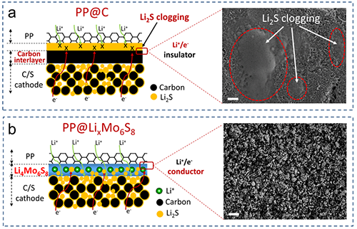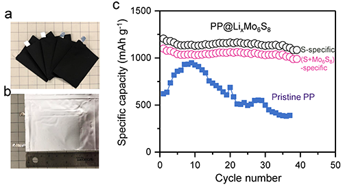 中国科学院物理研究所/北京凝聚态物理国家研究中心清洁能源重点实验室E01组索鎏敏副研究员与美国麻省理工学院李巨教授和薛伟江博士合作,在前期“嵌入-转化”混合电极大幅提升锂硫电池单体能量密度研究基础上(Nature Energy,4, 374–382,2019),首次开发了一种同时具有高电子-离子电导和电化学活性的Chevrel相Mo6S8隔膜多功能涂层,成功解决了上述问题,并将其应用到锂硫软包电池的研究中。