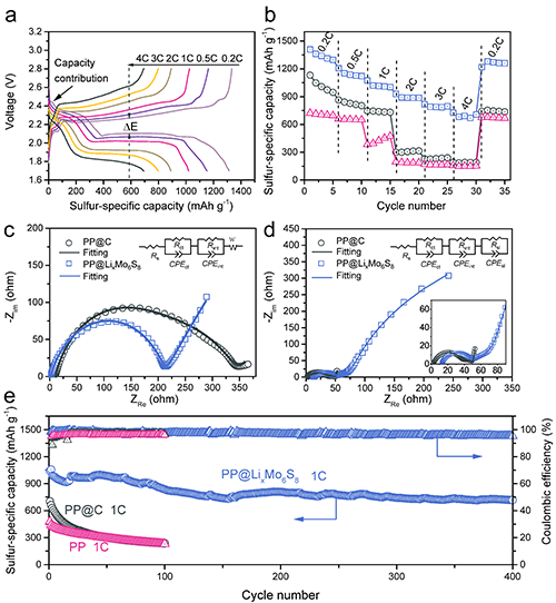 | 图 3. PP@LixMo6S8功能隔膜在扣式锂-硫电池中电化学性能 |