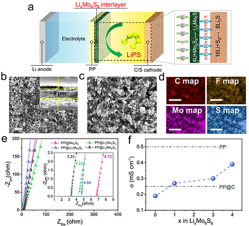 | 图 1. PP@LixMo6S8相关性质表征及其在锂-硫电池中工作原理示意图。 |
