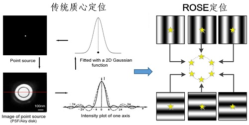 图1 左侧,传统质心拟合定位方法,右侧,ROSE干涉定位方法