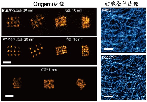 图2左侧,不同荧光位点间距的DNA origami成像,ROSE技术与传统的质心拟合方法进行对比验证。右侧,鬼笔环肽标记的微丝成像,ROSE技术与传统的质心拟合方法进行对比验证。