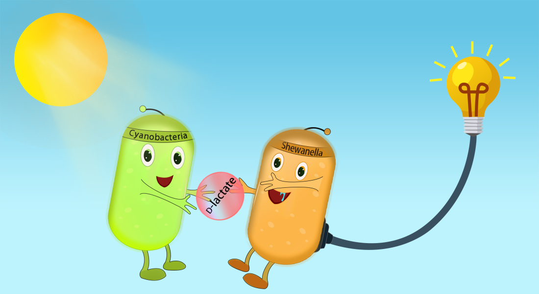 该合成微生物组由一个能够将光能储存在d-乳酸的工程蓝藻和一个能够高效利用d-乳酸产电的希瓦氏菌组成(图1)。在这个合成微生物组中,d-乳酸是两种微生物间的能量载体。蓝藻吸收光能并固定CO2来合成能量载体d-乳酸,希瓦氏菌氧化d-乳酸进行产电,由此形成一条从光子到d-乳酸再到电能的定向电子流,完成从光能到化学能再到电能的能量转化过程。