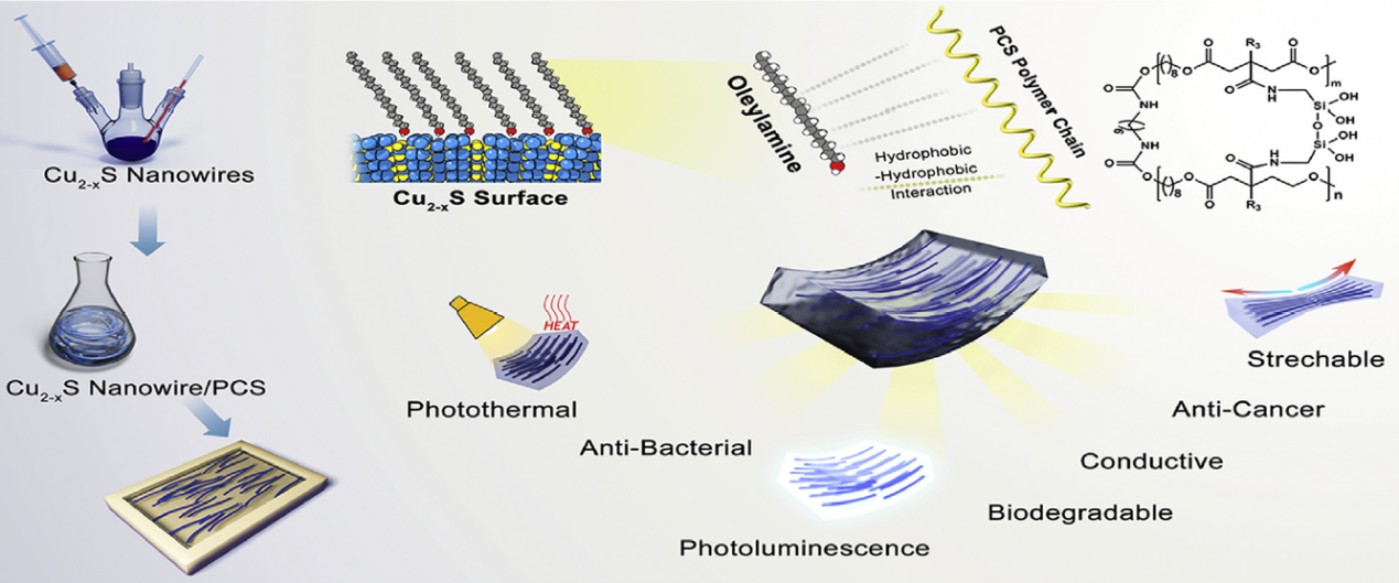 针对上述问题和临床需求,西安交通大学前沿院雷波课题组基于生物活性分子柠檬酸设计制备了一种超长硫化铜纳米线增强的聚硅柠檬酸酯杂化医用材料,实现了其弹性/抗菌/抗癌/导电/抗炎等多功能特性。该研究中,超长硫化铜纳米线通过超分子作用如氢键和疏水作用实现与聚硅柠檬酸酯的有效杂化和组装,杂化材料中,硫化铜纳米线有效增强聚硅柠檬酸酯的弹性力学性质、抗菌、光热抗肿瘤及导电能力,聚硅柠檬酸酯赋予植入材料粘弹性、光致发光、抗炎生物活性等功能。该研究为研发具有内在抗感染、抗肿瘤、促组织修复、实时监测等诊断—治疗—组织再生一体化的新型可降解生物材料提供了一种有效的思路和策略。