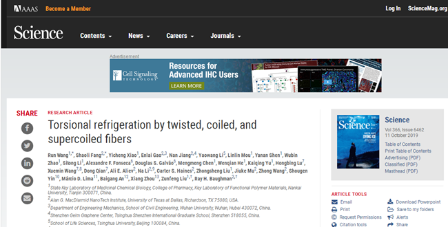 南开新闻网讯(记者 吴军辉)更加高效、节能、绿色、便携的制冷方式是人类不懈探索的方向。10月11日在线出版的《科学》(Science)杂志刊文,报道了中国南开大学与美国德克萨斯州立大学达拉斯分校的一支国际联合研究团队研获的一种柔性制冷新策略——“扭热制冷”。他们发现,改变纤维内部的捻度可以实现降温。由于制冷效率更高、体积更小且适用于天然橡胶、钓鱼线以及镍钛合金等多种普通材料,基于这种方法制成的“扭热冰箱”也变得前景可期。
