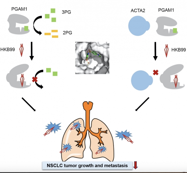 联合课题组运用多种技术手段,通过基于结构的药物设计改造优化,得到了一种新型的PGAM1别构抑制剂,并将其命名为HKB99。这种抑制剂具有高选择性、高活性、低毒性的优势。研究显示,HKB99通过抑制3-PG向2-PG的转化阻断细胞内生物大分子合成和破坏氧化还原稳态,使得非小细胞肺癌和厄洛替尼耐药的肺癌细胞无法生长。此外,HKB99通过抑制PGAM1蛋白与ACTA2蛋白的相互作用进一步抑制非小细胞肺癌细胞的转移。研究工作以小分子同时干预蛋白的酶和非酶功能的双重作用,进一步验证了PGAM1是一个治疗肺癌的潜在药物靶标,为开发具有全新作用机制的抗肿瘤药物提供了新的方向。