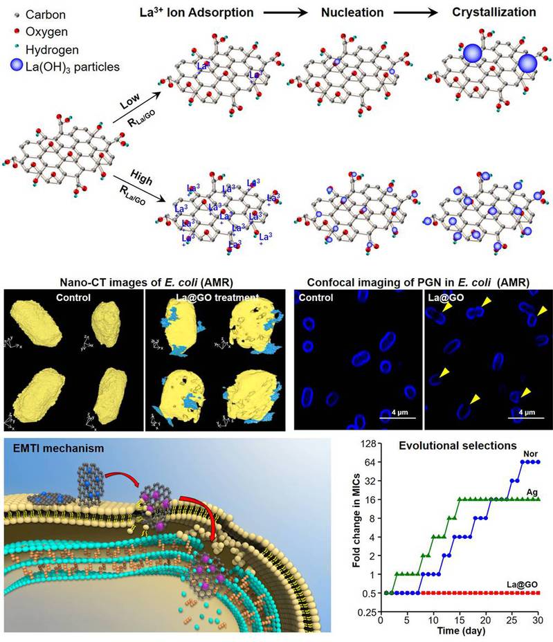 设计一种氧化石墨烯与稀土氧化镧的新型纳米复合材料(La@GO)。利用同步辐射技术,液相色谱-质谱及高分辨荧光显微镜等技术发现,该复合物具有细菌外多靶点侵袭(EMTI)的独特杀菌机制:与细菌膜接触后通过去磷酸化和脂质过氧化作用破坏细菌磷脂层,破坏细菌肽聚糖层。相比抗生素和银纳米粒子,该石墨烯复合物具有两个优势:①La@GO的杀菌性能不受已发现超级细菌耐药机制的影响;②在对超级细菌长期的压力处理下,La@GO不会引发细菌耐药性的进化(图1)。