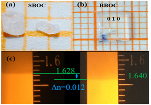 最近,中国科学院新疆理化技术研究所中科院特殊环境材料与器件重点实验室潘世烈研究员带领的团队一直致力于探索大双折射材料及产生大双折射率的来源机制,通过对首例Sn2+的硼酸盐氯化物Sn2B5O9Cl和同构碱土金属硼酸盐的双折射率测试研究,首次从实验上证明拥有立构活性的Sn2+能够激发双折射率的大幅增益。团队研究人员在密闭体系下得到了Sn2B5O9Cl晶体(1 × 1 × 0.5 mm3),并且通过顶部籽晶法得到同构的Ba2B5O9Cl晶体(5 × 4 × 1.0 mm3),借助偏光显微镜和宝石折射率仪测量了晶体的双折射率。实验数据和理论计算结果都显示出Sn2B5O9Cl拥有超大的双折射率(0.168@546 nm),其双折射率更是同构化合物Ba2B5O9Cl的16.8倍(0.010@546 nm)。