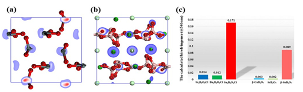 研究人员结合理论计算和结构对比分析双折射率大幅增益的来源。Sn2B5O9Cl大的双折射率主要来源于高度畸变的锡氧氯多面体以及畸变BO3基团的贡献,然而这些畸变在同构化合物Ba2B5O9Cl是不存在的。通过实空间原子切割的方法进一步说明了大双折射率的增益是来源于立构活性的锡氧氯多面体。