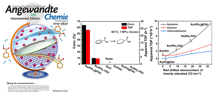 苯甲酸加氢制备环己基甲酸是工业生产尼龙6原料己内酰胺的重要中间过程,但是金属纳米粒子催化剂对此反应的活性不高,尤其是在非质子性溶剂中。为了提高金属纳米粒子的催化活性,该团队在有机功能基团(如氨基,三苯基膦,二苯基膦,苯基)修饰的纳米反应器中引入Ru纳米粒子。研究表明,膦配体修饰纳米反应器中的Ru纳米粒子在正己烷中可高效催化苯甲酸加氢,而其他纳米反应器中的Ru纳米粒子以及商业化Ru/C不表现催化活性。理论计算和实验结果表明,膦配体的修饰改变了钌的微环境,诱导苯甲酸的芳香环在Ru金属表面优先吸附,从而增强其催化性能。同时研究还发现,膦配体修饰的纳米反应器可大幅度增强Ru纳米粒子对苯、甲苯、三氟甲苯的加氢活性,主要归因于膦配体的给电效应增强了Ru表面电子密度。纳米反应器微环境调控催化活性和选择性的策略为发展高效催化体系提供了新思路。