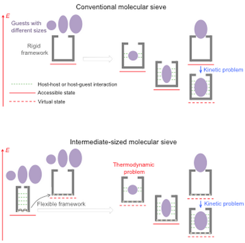 将传统分离纯化技术如蒸馏改为基于多孔材料的吸附分离有望大大降低能耗。分子筛(molecular sieve)具有分子级均匀孔径,可以只让小于孔径的分子通过,能达到理想的吸附选择性。但是,当混合物中存在多种尺寸各异的成分,而且提纯目标不是尺寸最小的成分时,分子筛的效果就会大打折扣。例如,苯乙烯的尺寸介于乙苯和苯/甲苯之间,用分子筛无法通过一次吸附获得高纯苯乙烯。