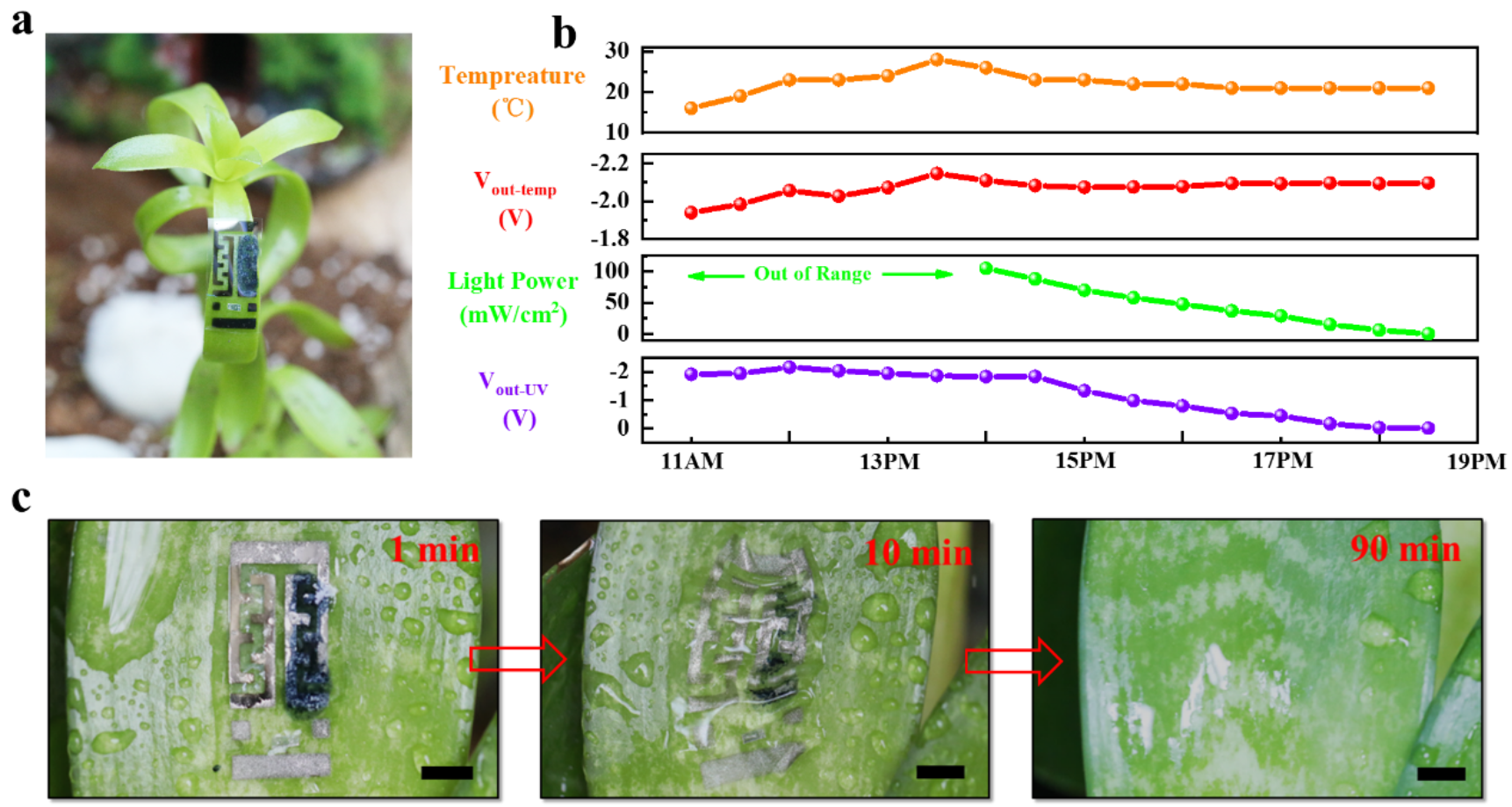 a-c分别为:位于植物叶片上的传感系统;传感系统对于环境中光强和温度进行实时监测;传感系统在人造雨环境中的降解