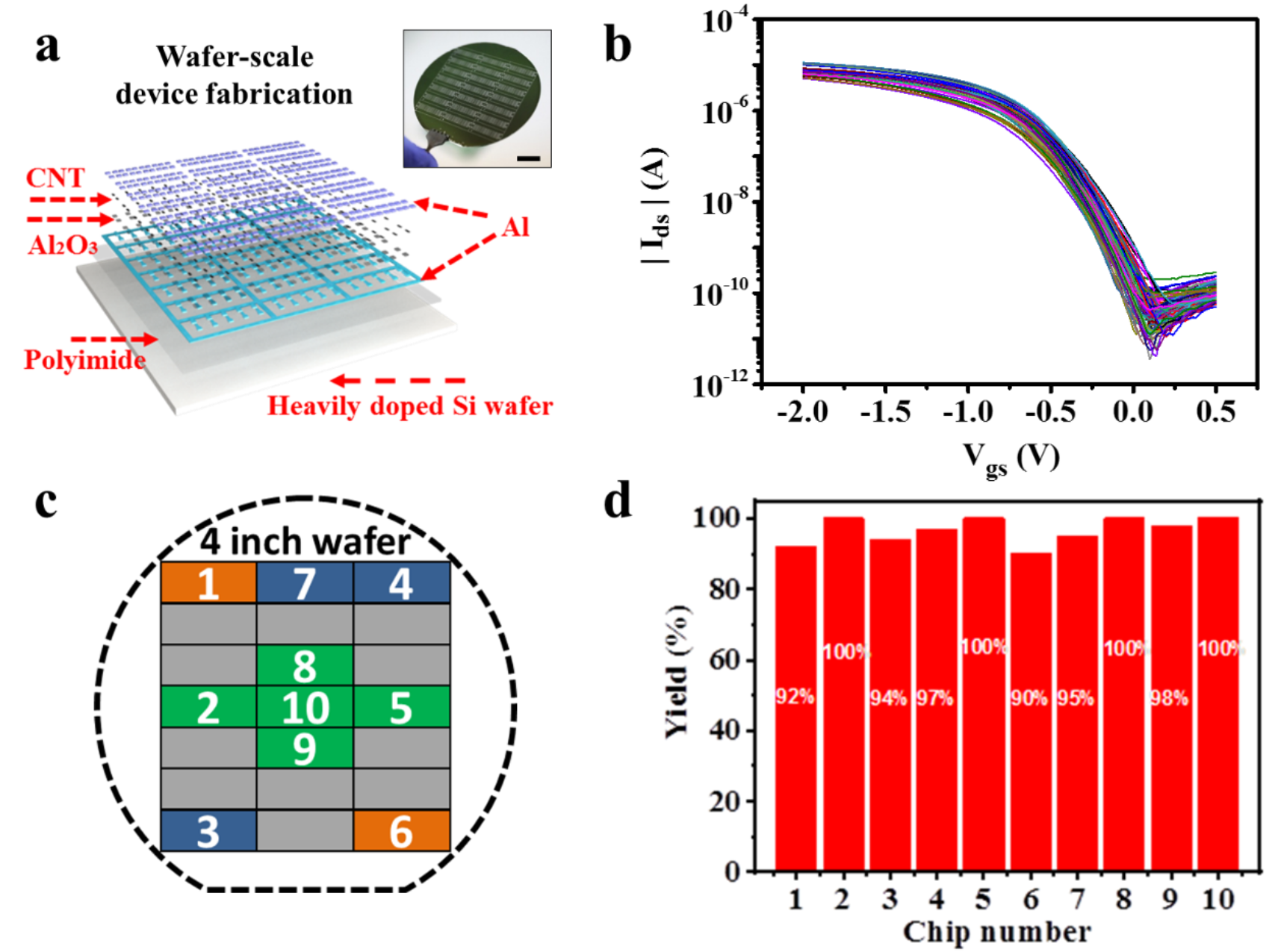a-d分别为:器件的晶圆尺寸加工;加工所得到的器件性能高度均一性;器件产率的空间分布;不同芯片的器件产率统计情况