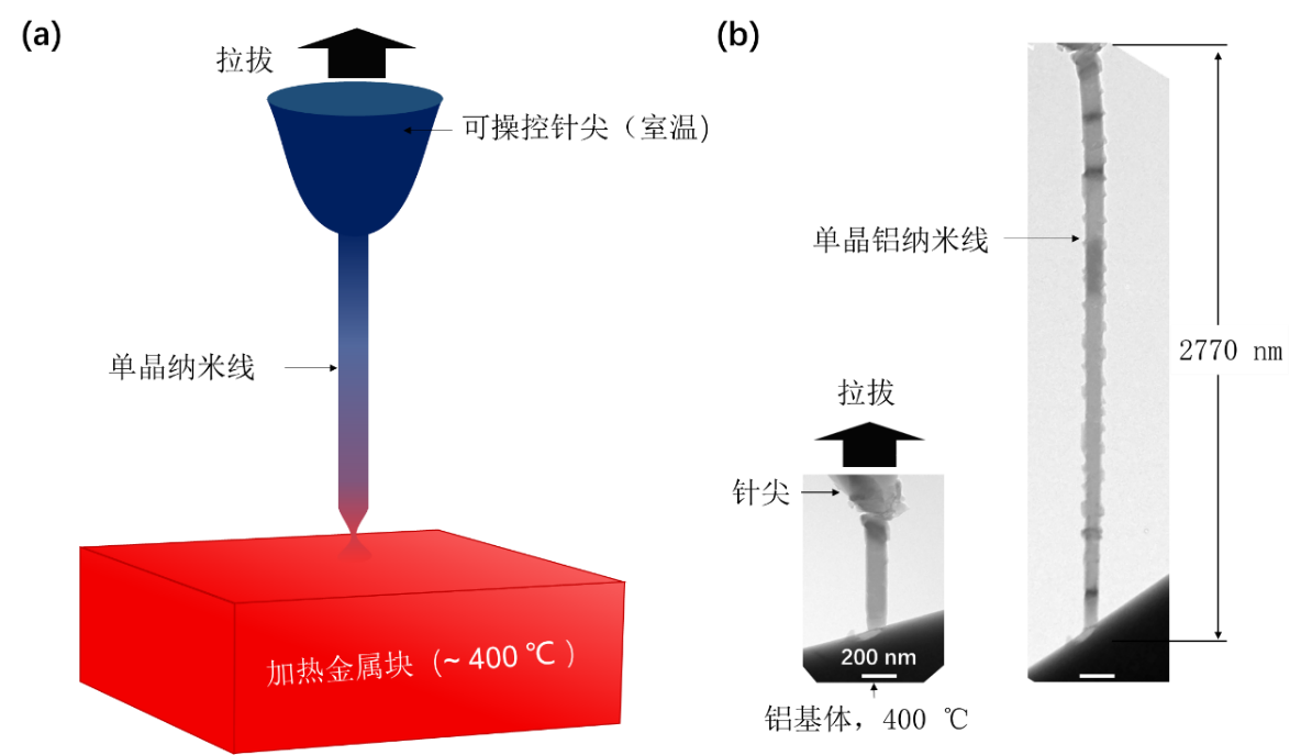 受启发于宏观块体单晶的提拉法制备工艺(Czochralski Method),西安交大科研人员提出了一种基于热迁移的纳米线生长方法:在纳米尺度操控一个尖端曲率在100纳米左右的针尖(保持室温)去接触加热金属固体的表面,由于尖端与金属基体接触点间形成的巨大温度梯度,金属基体中的原子可以通过表面的类液层,在热迁移的影响下快速沉积到尖端。如果后撤针尖,原子会不断在纳米线/基体晶界处沉积,从而均匀生长成纳米线结构。研究团队在透射电镜中实现了该过程的原位观测,证实了该方法对于Al、Au、Ag、Cu、Sn等常见金属的纳米线制备均适用,其纳米线的均匀生长速率可达~3 nm/s。并且该方法具有良好的生长可控性,可以通过对尖端的位移控制来调控纳米线的生长形态和直径。