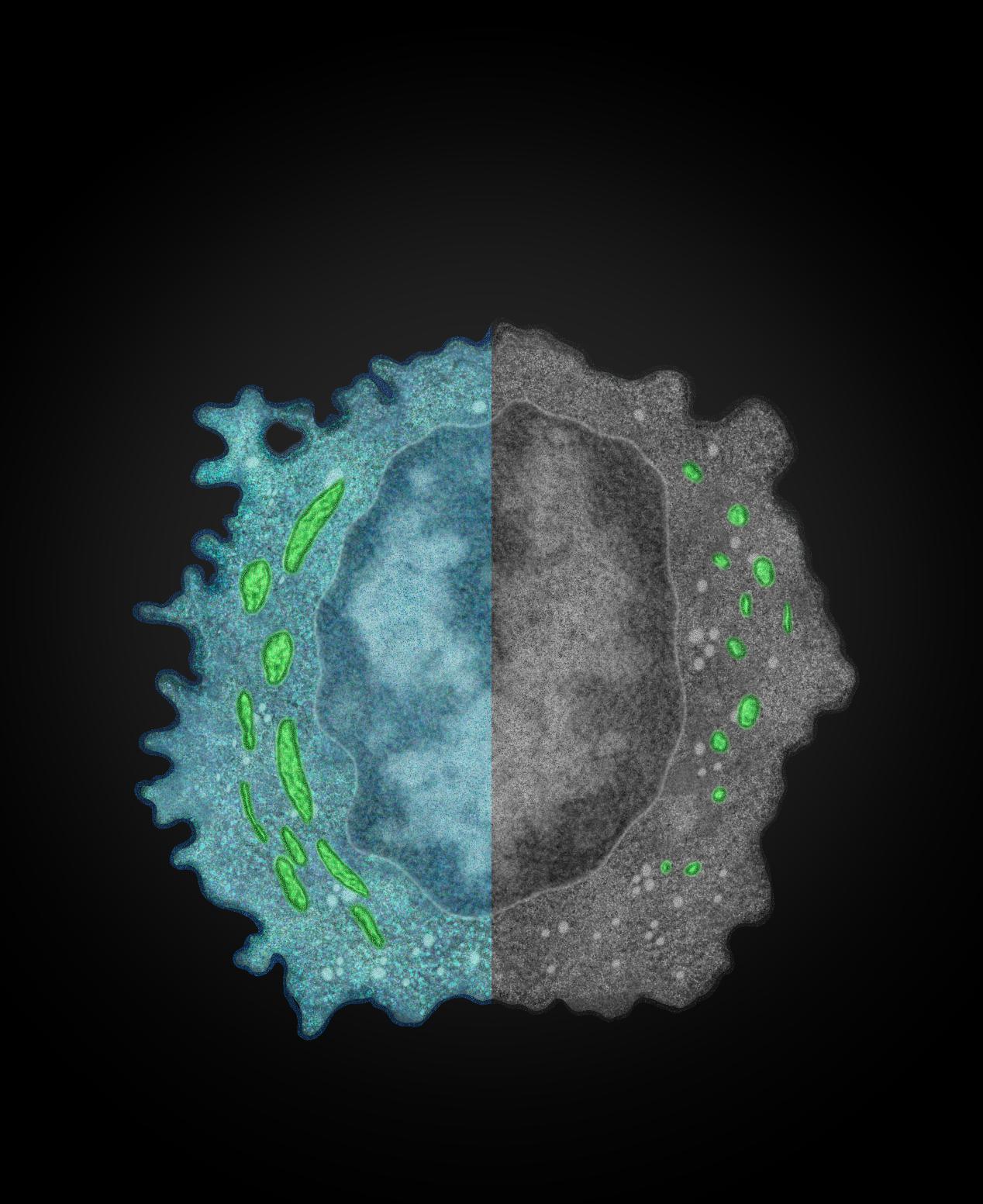 图1 正常NK细胞线粒体呈现管状(左半球,绿色)而肿瘤浸润NK细胞线粒体呈现碎片状(右半球,绿色),(郑小虎提供电镜照片;王国燕、陈磊艺术化)