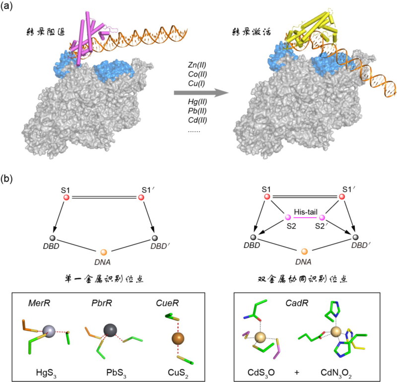 例如,为了应对复杂严酷的外界生存条件,大多数细菌染色体中都有一套或数套金属调控蛋白质,它们可以调控细菌防御系统以抵御金属离子的毒性或较高浓度金属离子水平。由于上述金属蛋白质的保护,这些细菌可以长期生存在重金属等污染的水质和土壤中。这些金属调控蛋白质中有一类名为MerR的转录因子家族,在上述生理活动中表现出非常独特的性质。其家族成员可以有效地高灵敏性、高选择性识别和结合Hg2+、Cd2+、Zn2+、Fe2+、Cu+、Ag+、Au+、Pb2+等金属离子,并采用特殊的启动子DNA区域扭曲调控机制,使得MerR等蛋白质可以随体内金属离子浓度变化在阻遏构象和激活构象之间发生转换,启动或关闭下游细菌防御系统(图1a)。