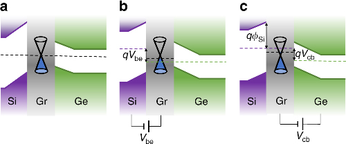 图4 考虑石墨烯量子电容效应时晶体管的能带示意图。a. 无偏压。b. 发射结正偏。c. 集电结反偏。相关物理现象及应用研究介绍详见论文补充材料。