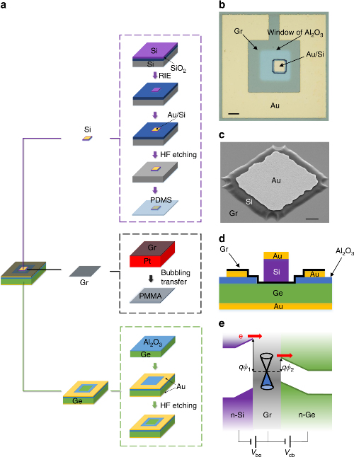 图1 硅-石墨烯-锗晶体管的设计和制备。a. 器件的制备流程。b-d. 器件的光学、SEM和截面示意图。e. 器件原理示意图。