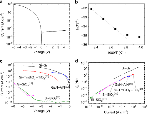 图2 硅-石墨烯发射结性能。a. 发射结IV曲线。 b. 漏电流和温度的依赖关系。c. 与隧穿发射结的开态电流的对比。 d. 与隧穿发射结的共基极截止频率的对比。