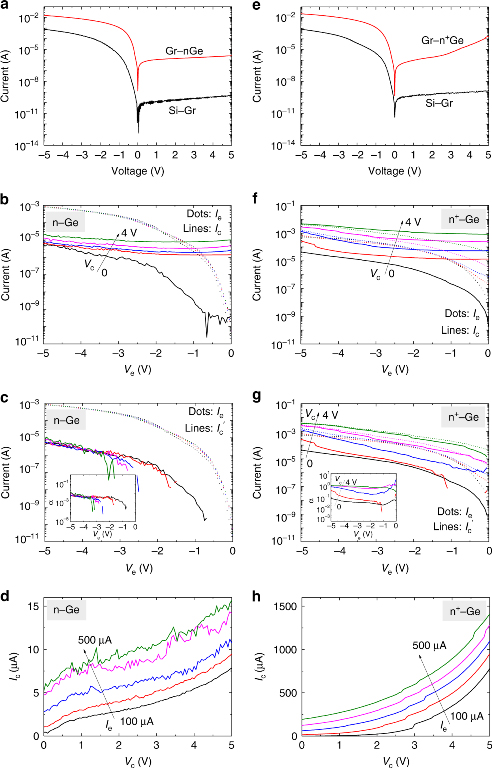 图3 硅-石墨烯-锗晶体管性能。a-d. 使用轻掺杂Ge衬底时的硅-石墨烯发射结和石墨烯-锗集电结IV曲线、输入(Ie-Ve)和转移(Ic-Ve)特性曲线、共基极增益α、输出特性(Ic-Vc)曲线。e-h. 使用重掺杂Ge衬底时的相应曲线。