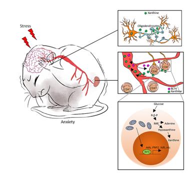 线粒体为细胞的生命活动提供能量,线粒体形态的变化参与了细胞代谢调控,对于细胞的正常发育维持维持至关重要。Miga2是一种线粒体外膜蛋白,敲除Miga2会导致线粒体嵴结构遭受严重破坏,失去正常情况下管状或网状的形态而呈现片段化形态。柴人杰课题组在电生理听力学检测中发现,在小鼠T细胞内特异性敲除MIGA2后,小鼠表现出听力受损的现象,对于外界多种频率声音刺激的听觉脑干诱发电位(ABR)低于普通小鼠。为了进一步了解免疫细胞中线粒体形态如何影响动物生理反应,柴人杰课题组与浙江大学靳津团队合作,利用各种动物行为学实验作为评价标准,发现体内缺少CD4+ T细胞的小鼠可以避免因外界压力下的慢性应激诱导产生心理疾病。实验数据显示,在慢性应激状态下,小鼠体内白三烯b4含量上升,使包括Naive T细胞在内的大量非炎性CD4+ T细胞线粒体碎裂。相应的代谢组学和转录组分析表明,CD4+ T细胞中线粒体碎裂可导致转录因子IRF1累积,IRF1与Ada、Xdh和Pnp2启动子区结合使葡萄糖更多的通过戊糖磷酸途径代谢,促进嘌呤从头合成。慢性应激焦虑模型中,小鼠血清黄嘌呤含量有显著的上升。柴人杰课题组从南京鼓楼医院采集到的临床证据也表明,焦虑症患者与健康对照组相比血清黄嘌呤水平升高。大脑杏仁核在恐惧与焦虑的产生中起着关键作用,T细胞产生的过量嘌呤(包括次黄嘌呤和黄嘌呤)通过血液循环进入脑部,与脑左侧杏仁核中少突胶质细胞上的腺苷受体A1结合,引起少突胶质细胞活化并增殖,继而过度活化左侧杏仁核区域神经元导致焦虑症状;同时利用脑定位注射装置向小鼠左侧杏仁核中注射腺相关病毒,特异性地敲除少突胶质细胞中的受体A1,敲除A1后焦虑小鼠症状有明显恢复,验证了以上结论。