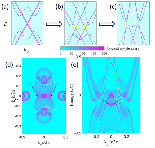 | 图二:(a)-(c)表示由两次反带形成的两个表面Dirac锥的演化,杂化后打开能隙。 实际材料β-MoTe2中,(001)表面上的费米面 (d)和表面态沿着ky的色散(e)。 |