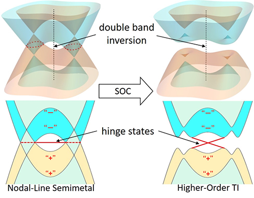 拓扑材料的发现对新的拓扑态和新奇物性的研究具有重要的意义。不久前,通过拓扑量子化学[1],对称性指标[2,3]等手段对无机晶体材料做了地毯式的搜索和分类,可以通过开源程序(https://github.com/zjwang11/irvsp)判别任何非磁晶体材料的拓扑性质 (www.cryst.ehu.es/cryst/checktopologicalmat)[4]。高阶拓扑绝缘体(higher-order topological insulators) 在这次搜索中也无处遁形。 人们定义: 一阶拓扑绝缘体具有绝缘的d维体态,但有(d-1)维拓扑保护的金属表面态; 二阶拓扑绝缘体具有绝缘的d维体态和(d-1)维表面态,但有(d-2)维拓扑保护的金属棱态;以此类推。所以常规的三维拓扑绝缘体,又可以被称为三维的一阶拓扑绝缘体。物理系统中的对称性一直可以大大的简化我们的研究,比如三维(一阶)拓扑绝缘体在有中心反演的情况下,其Fu-Kane Z2拓扑指标可以简化为所有占据态八个时间反演不变点奇宇称能带的对数的总和,再对二取余。这样我们就知道,对于有中心反演的体系,不同宇称的能带在时间反演不变点发生一次能带反转(band inversion,简称“反带”),就可以得到拓扑节线半金属(不考虑自旋轨道耦合SOC)和拓扑绝缘体(考虑SOC)。如果同样的反带发生两次(double band inversion),如图一所示,虽然它对应的Fu-Kane Z2拓扑指标都是零, 但是拓扑量子化学以及后来发展的等价的对称性指标都显示它是拓扑非平庸的。