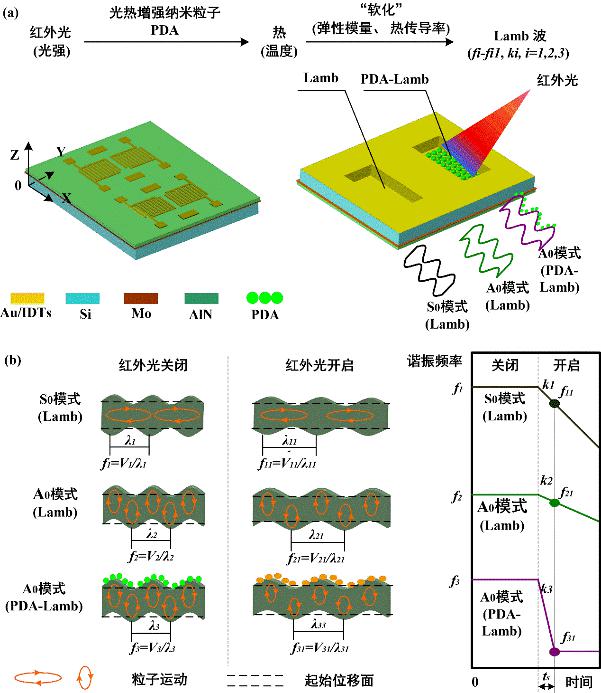 图1 (a)一种基于光-热-声效应的非制冷近红外探测器原理图,(b)红外光照射前后,Lamb的S0、A0模式和PDA-Lamb的A0模式三种模式频率特性示意图