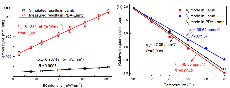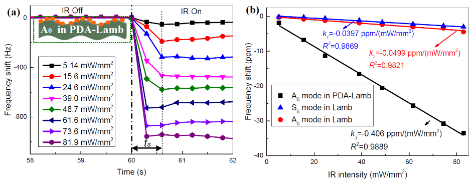 研究人员将Lamb波传感器的零阶对称(S0)模式和零阶反对称(A0)模式,以及PDA-Lamb的A0模式三种模式作为研究对象。三种模式在红外光照射前后分别产生不同的频移,通过比较频率相对移动量来反映红外探测的灵敏度。结果表明:红外光开启瞬间,PDA涂覆的Lamb波传感器(PDA-Lamb)谐振频率相对变化量与红外辐射强度呈高度线性关系,PDA-Lamb比未涂覆通道高近1个数量级。灵敏度的增强得益于光-热转化效率的提升,而涂覆前后热-声转化效率基本不变。该研究为高性能薄膜压电声波红外探测器的设计与优化提供了参考依据,将有助于在红外治疗等领域得到应用。