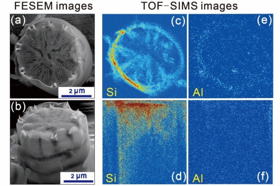 图1. 梅尼小环藻生物硅的场发射扫描电镜(FESEM)图(a和b);以及飞行时间二次离子质谱的元素分布图(硅分布的俯视和侧视图:c和d;铝分布的俯视和侧视图:e和f)