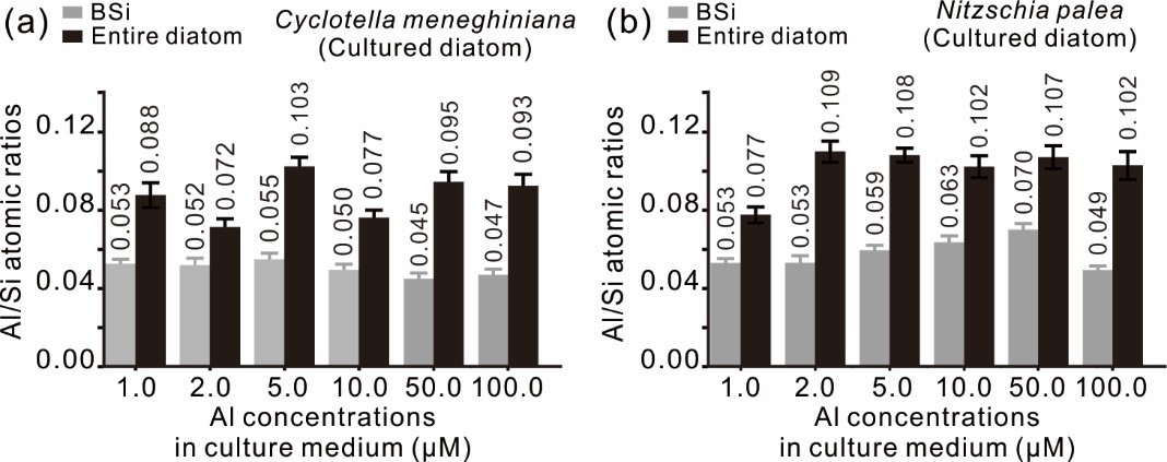 图2. 不同铝浓度下培养的梅尼小环藻(图a)和谷皮菱形藻(图b)及其生物硅中的铝硅原子比