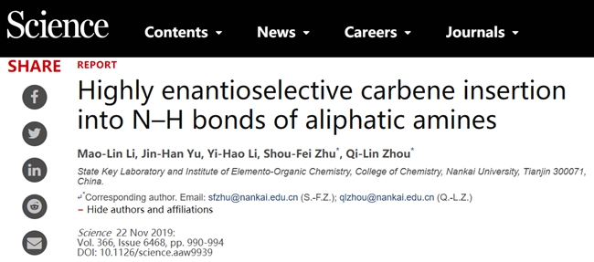 南开新闻网讯(记者 马超)11月22日,国际著名期刊《Science》在线发表南开大学周其林和朱守非团队题为 “Highly enantioselective carbene insertion into N-H bonds of aliphatic amines”(卡宾对脂肪胺氮-氢键的高对映选择性插入反应)的研究论文。