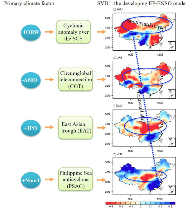 研究表明,从春到冬,伴随热带东太平洋型(EP-)ENSO事件的发展,中国区域干湿变化主导模态表现为西南的湿异常逐渐东移,北方干异常逐渐南退的季节变化特征(图1);从冬到秋,伴随热带中太平洋型(CP-)ENSO事件的发展,中国区域干湿变化第二模态表现为南方逐渐变干、西北和东北逐渐变湿的季节演变特征。进一步研究发现,中国区域干湿变化受多种海温异常信号的共同影响。其中,AMO通过对流层中高层的经向波列和“海气耦合桥”影响干湿分布的年代际变化,ENSO相关的海温异常事件通过“大气桥”作用于中国区域干湿分布的年际-年代际变化。