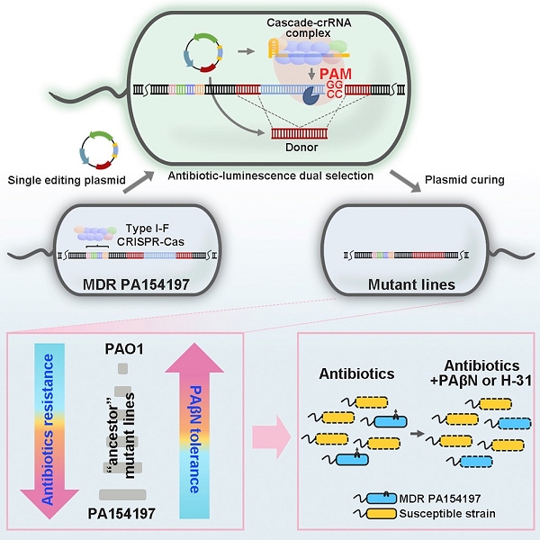 中国科学院微生物研究所向华团队长期从事微生物CRISPR-Cas系统分子机制的研究,在致力于开发基因编辑新元件新机制的同时,近年来积极倡导利用原核微生物自身的CRISPR-Cas系统发展重要原核微生物基因组编辑技术,推动对微生物世界生命机制更加深入系统理解和开发应用。2019年11月5日,向华团队和香港大学闫爱新团队联合在Cell Reports上发表了题为“Native CRISPR-Cas-Mediated Genome Editing Enables Dissecting and Sensitizing Clinical Multidrug-Resistant P. aeruginosa” 的文章。作者以多重耐药研究中最重要的标准参照病原菌铜绿假单胞菌作为研究对象,报道了在临床多重耐药铜绿假单胞菌中开发基于内源性I-F型 CRISPR的、高效简便的基因编辑系统,并在该系统的辅助下,实现了在临床多重耐药菌株自身遗传背景下耐药机制的原位解析和抗耐药化合物的筛选。