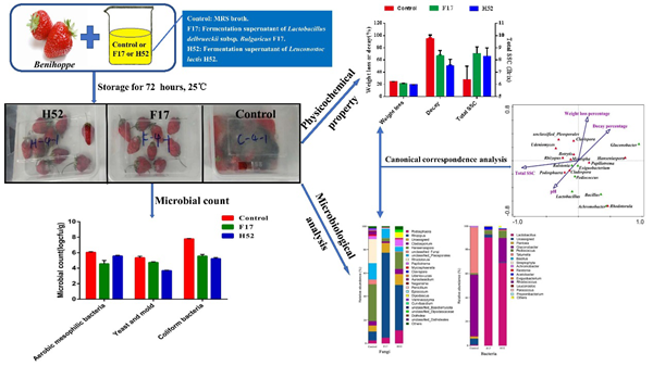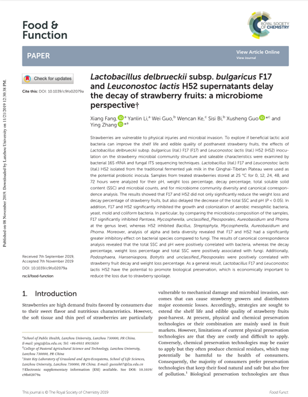近日,公共卫生学院张莹讲师团队在农林科学TOP期刊Food & Function发表最新研究成果"Lactobacillus delbrueckiisubsp. bulgaricus F17 and Leuconostoc lactis H52 supernatants delay the decay of strawberry fruits: a microbiome perspective",该论文的通讯作者为张莹讲师,共同通讯作者为郭旭生教授,第一作者为学院2017级硕士研究生方响。