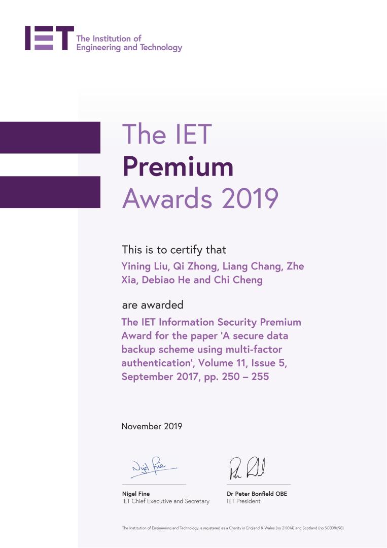 近日,我院刘忆宁教授于2017年发表在IET Information Security的论文“A secure data backup scheme using multi-factor authentication, Volume 11, Issue 5, September 2017 , p. 250 - 255.”,被IET (The Institution of Engineering and Technology, 英国工程技术学会),评为2019年度最佳论文(Premium Award for Best Paper),该奖项由IET每年评选一次,奖励过去两年(2017.1-2018.12)发表在IET系列期刊、具有高影响力的学术论文,每个期刊仅由一篇论文获得Best paper。