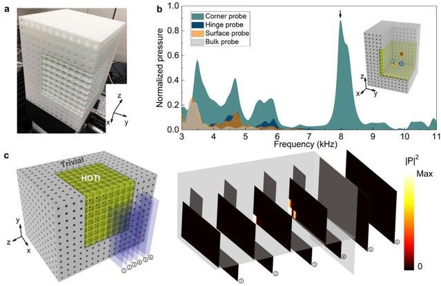 图4.零维角态的实验表征。a.3D打印样品,用以测量拓扑界面态、棱态以及角态。b.实验测量的透射谱:其中界面态对应橘黄色线/阴影、棱态对应深蓝色线/阴影、角态对应深绿色线/阴影。可以看出角态的响应发生在体态、界面态以及棱态的带隙中。此外,界面态与棱态的响应在不同的频率范围有不同的响应强度,说明这些拓扑态可以用不同频率独立激发,体现了其多维层级的特征。c.角态的声场实验扫描切面图。可以看到,激发的声场主要局域在角上,远离角声场快速衰减。这些特征与角态相符合。