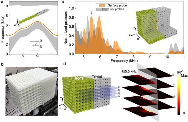 图2.二维界面态的理论计算及实验表征。a.一维超晶格(由平庸晶格和拓扑非平庸晶格构成,只在一个方向打开边界)的投影能带。在体带隙中发现局域的拓扑界面态(由橘黄色线表示)。b.3D打印样品,用以测量拓扑界面态。c.样品透射谱的实验测量,其中界面态的响应曲线为橘黄色线/阴影,可以看出其响应高于体态(灰色的线/阴影),说明界面态可以被独立激发。d.界面态的声场实验扫描切面图。可以看到,激发的声场主要局域在x-y面上,远离这个面声场快速衰减。这些特征与界面态相符合。