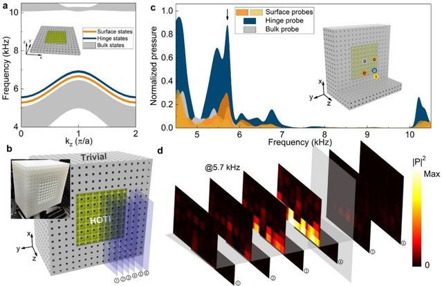 此前,人们普遍认为拓扑材料都遵循严格的体-边对应关系:即拓扑表面态只出现在比材料本身低一个维度的边界上。因此,如果要同时实现二维表面态、一维边界态和零维局域态,则需要设计多种不同几何结构的拓扑材料,这大大增加了波调控和器件设计的复杂性,进而限制了器件的集成化和微型化。如何能够在同一个材料中实现拓扑保护的二维界面、一维波导以及零维腔?这个问题的解决不仅在拓扑物理上有重要的理论意义,而且对拓扑材料和器件的应用有重要的价值。针对这一问题,该文设计和实现一类三维高阶拓扑材料,它同时存在具有拓扑鲁棒性的二维界面态、一维棱态以及零维角态。这一现象的理论基础是一种新的高阶多维度的体-边对应关系:即层级体-界面-棱-角对应关系。文章发现,系统中不同维度的拓扑态可以在频域上分离,这意味着人们可以在不同的频率上,对不同维度的声/光波进行独立调控。这一成果是高阶拓扑态研究的一项重要进展,具有重要的理论价值和应用前景。